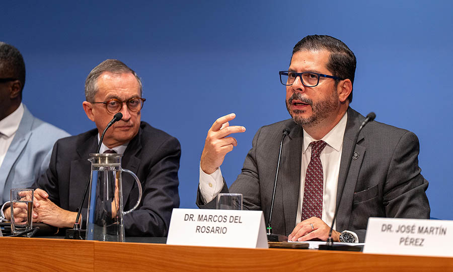 Tras la breve intervención, Del Rosario Rodríguez hizo la primera pregunta, relacionada con las principales amenazas para los derechos humanos, la democracia y el Estado de Derecho en el ámbito internacional.
